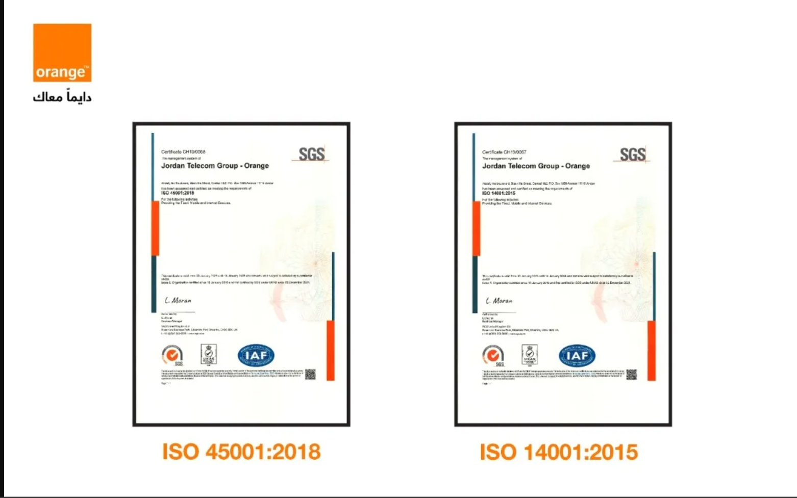 جددت أورنج الأردن حصولها على شهادة الأيزو (ISO 45001:2018) لأنظمة إدارة السلامة والصحة المهنية للمرة الثالثة على التوالي، وذلك بعد أن أثبتت قدرتها المتميزة على تلبية المتطلبات والمواصفات المعتمدة عالمياً. كما جددت الشركة حصولها على شهادة الأيزو (ISO 14001:2015) المتعلقة بمعايير نظام إدارة البيئة.