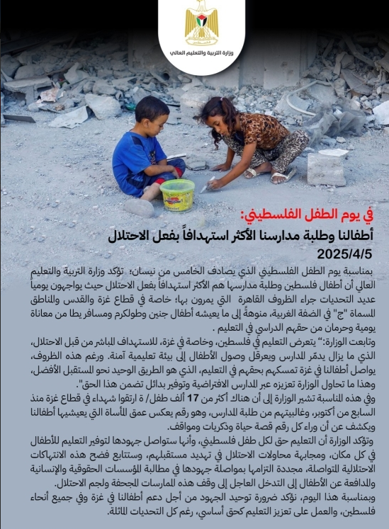 ذكرت وزارة التربية والتعليم أن أكثر من 17 ألف طفل وطفلة استشهدوا في قطاع غزة منذ 7 أكتوبر/تشرين الأول 2023.