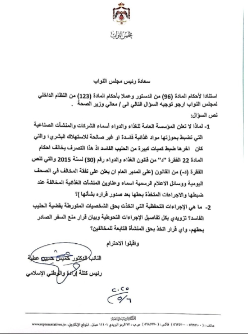وجه النائب الدكتور خميس عطية رئيس كتلة إرادة والوطني الإسلامي النيابية، سؤالاً نيابياً لمعالي وزير الصحة الدكتور فراس الهواري، ما أسباب عدم إعلان المؤسسة العامة للغذاء والدواء أسماء الشركات والمنشآت الصناعية التي تضبط بحوزتها مواد غذائية فاسدة، وهل هنالك إجراءات تحفظية اتخذت بحق تلك الشخصيات المتورطة بقضية الحليب الفاسد.