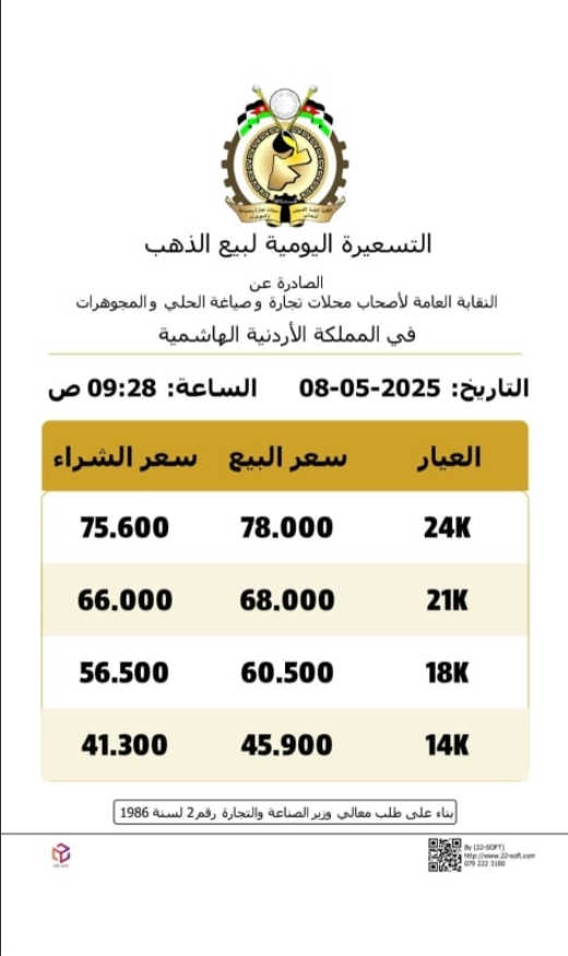 فيما بلغ سعر بيع الغرام الواحد من الذهب عيارات 24 و18 و14 لغايات الشراء من محالّ الصاغة 78 دينارا 60.50 دينار 45.9 دينار على التوالي.