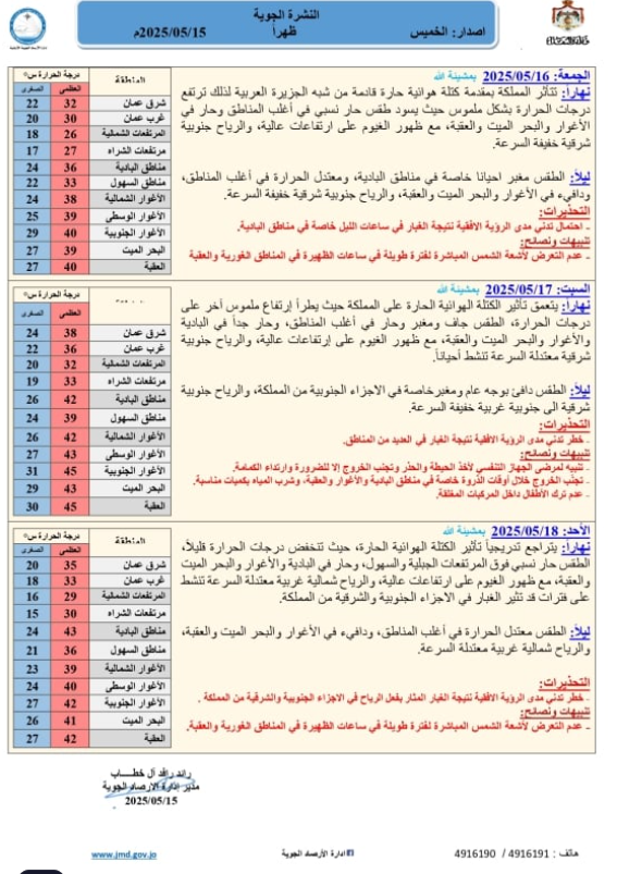 وقالت دائرة الأرصاد الجوية في نشرتها التفصيلية الصادرة ظهر الخميس إنه سيتعمق نهار السبت تأثير الكتلة الهوائية الحارة على المملكة، حيث يطرأ ارتفاع ملموس آخر على درجات الحرارة.