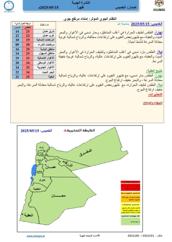 ويكون الطقس جافا ومغبرا وحارا في أغلب المناطق، وحارا جدا في البادية والأغوار والبحر الميت والعقبة، مع ظهور الغيوم على ارتفاعات عالية، والرياح جنوبية شرقية معتدلة السرعة تنشط أحياناً.