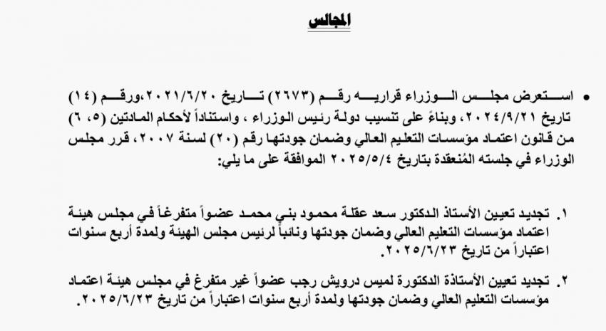صدر في عدد الجريدة الرسمية اليوم الخميس، قرار مجلس الوزراء، بناء على تنسيب رئيس الوزراء، تجديد تعيين الاستاذ الدكتور سعد عقلة محمود بني محمد عضوا غير متفرغا في مجلس هيئة اعتماد مؤسسات التعليم العالي وضمان جودتها، ونائبا لرئيس مجلس الهيئة ولمدة اربع سنوات بدءا من تاريخ 23/6/2025.