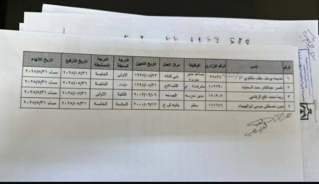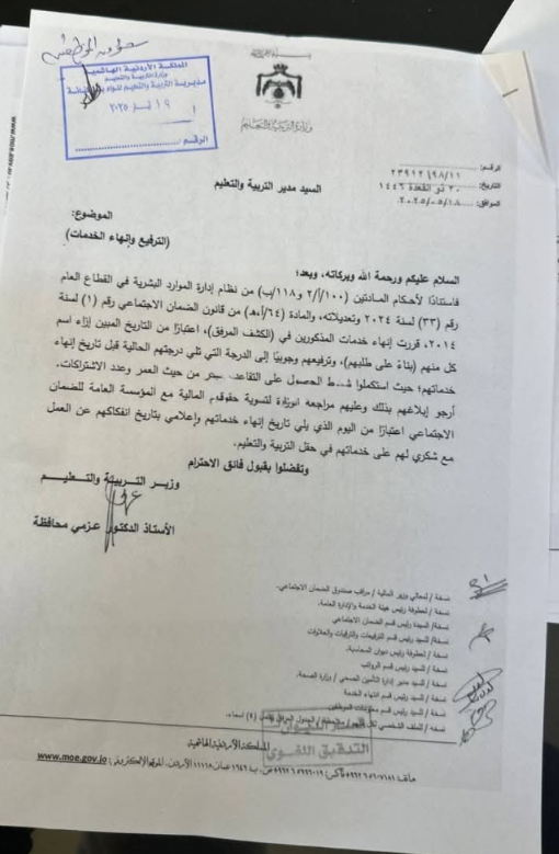 قرر وزير التربية والتعليم الدكتور عزمي محافظة، إنهاء خدمات موظفين بناء على طلبهم وترفيعهم وجوبيا الى الدرجة التي تلي درجاتهم الحالية قبل تاريخ انهاء خدماتهم حيث استكملوا شروط الحصول على التقاعد المبكر من حيث العمر وعدد الاشتراكات.