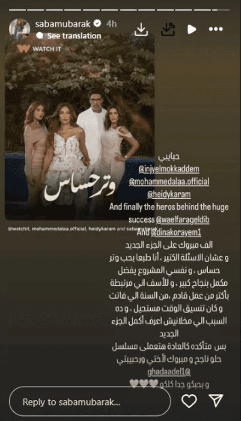 وكتبت صبا على خاصية "ستوري" عبر حسابها في إنستغرام: "ألف مبروك على الجزء الجديد! وبالنسبة للأسئلة الكثيرة، فأنا أحب مسلسل وتر حساس وأتمنى أن يستمر بنجاح. ولكن، للأسف، ارتباطي بعدة مشاريع أخرى منذ العام الماضي جعل تنسيق الوقت مستحيلًا، وهذا هو السبب الذي منعني من المشاركة في الجزء الجديد".