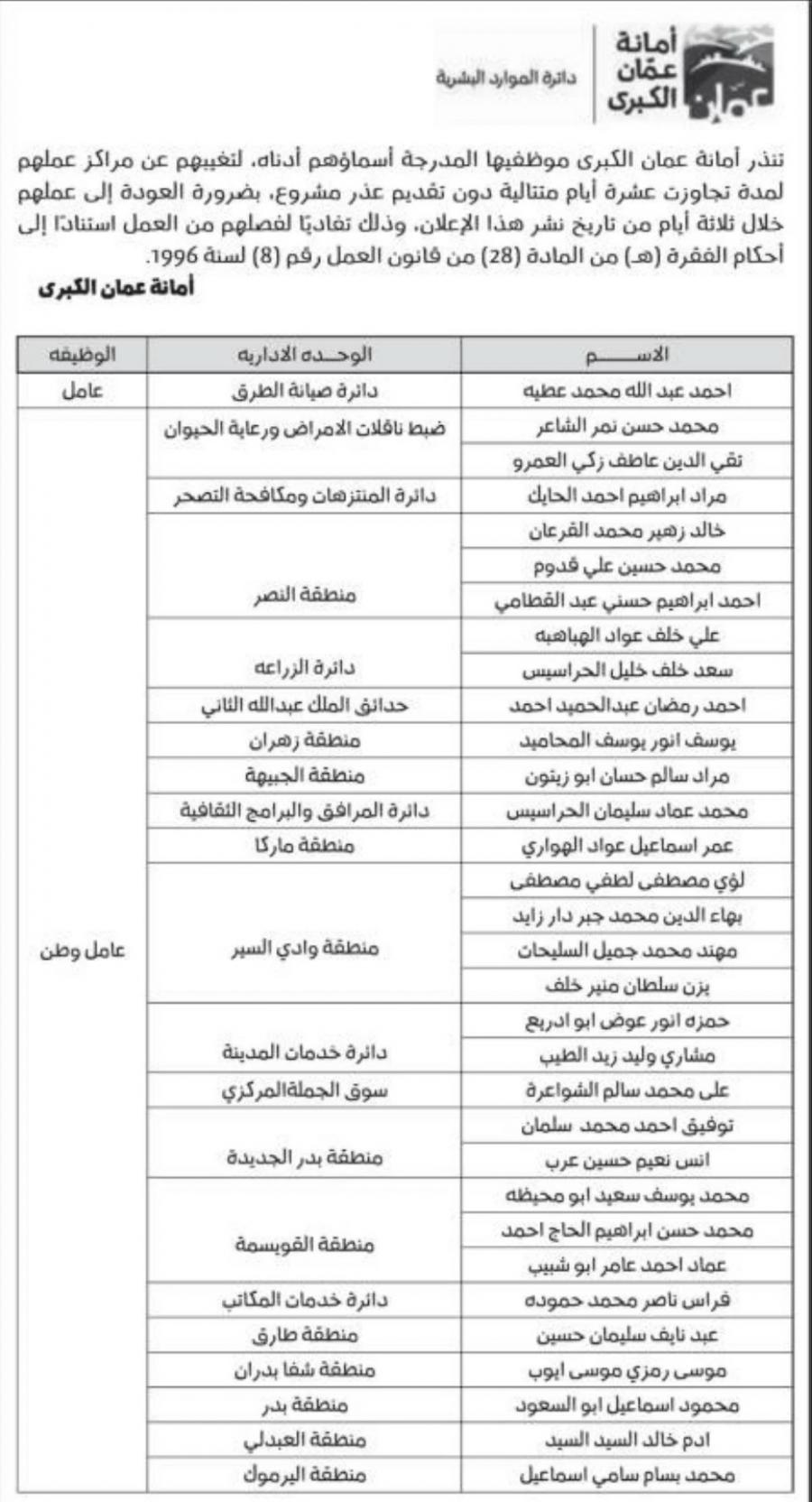 أنذرت أمانة عمّان الكبرى، اليوم الثلاثاء، 32 موظفاً، بالفصل من العمل في حال تخلفهم عن العودة لعملهم.
