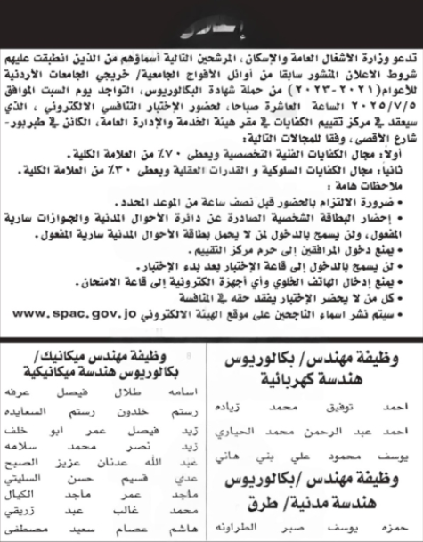 دعت وزارة الاشغال العامة والاسكان اليوم الثلاثاء المرشحين التالية اسماؤهم التواجد يوم السبت 5/7/2025 لحضور الاختبار التنافسي.