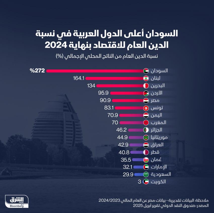 بحسب تقرير صندوق النقد، السودان هو الأعلى ديوناً بين الدول العربية، إذ بلغت نسبة الدين العام إلى الناتج المحلي 271.979% في عام 2024، ويُتوقع تراجعها إلى 251.98% هذا العام.