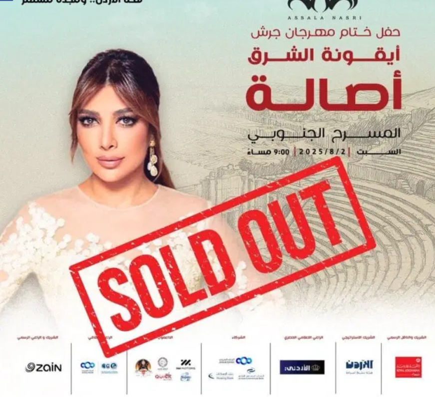 نفدت تذاكر حفل الفنانة أصالة نصري ضمن فعاليات مهرجان جرش للثقافة والفنون في دورته الـ39، وذلك منذ يوم أمس الخميس، قبل يومين من موعد الحفل المقرر يوم غد السبت 2 آب 2025، في ختام المهرجان وعلى المسرح الجنوبي.