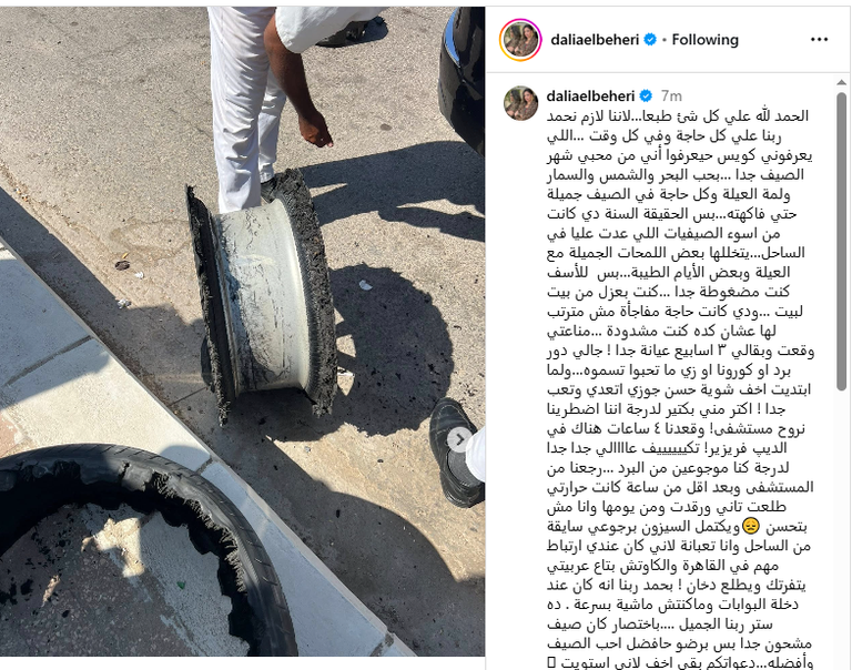 ونشرت داليا البحيري عبر حسابها على إنستغرام صورة من موقع الحادث، وعلقت قائلة: "الحمد لله دائمًا وأبدًا.. نجايني ربنا في لحظة كانت ممكن تكون خطيرة جدًا، لكن ستره كان حاضرًا".