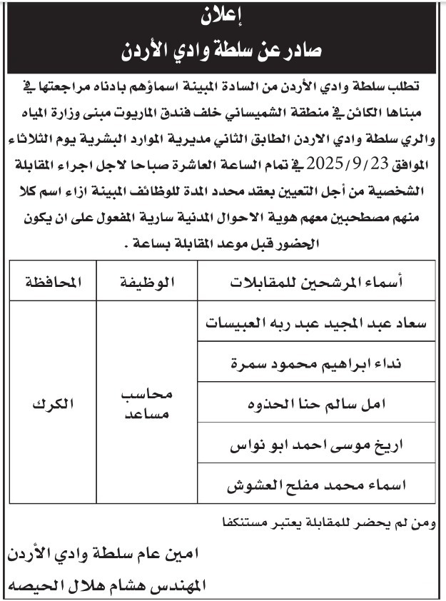 دعت سلطة وادي الاردن اليوم الثلاثاء التالية اسماؤهم لاجراء المقابلات الشخصية.