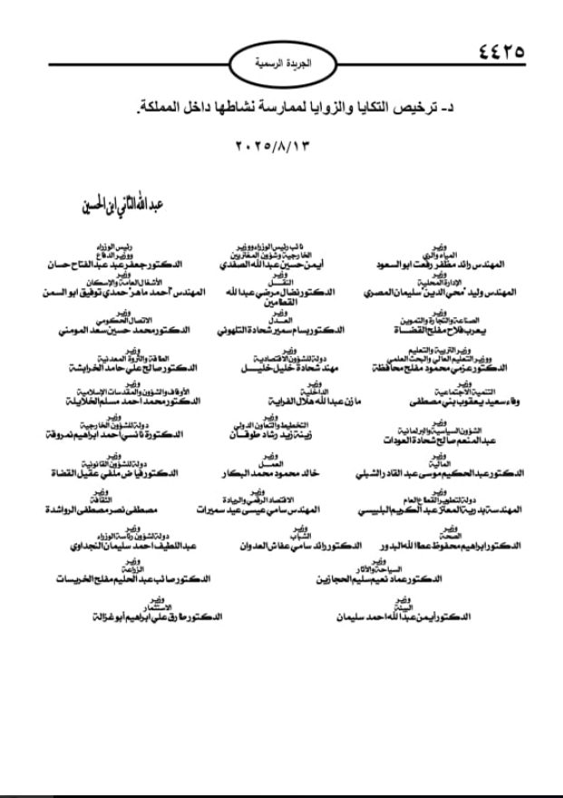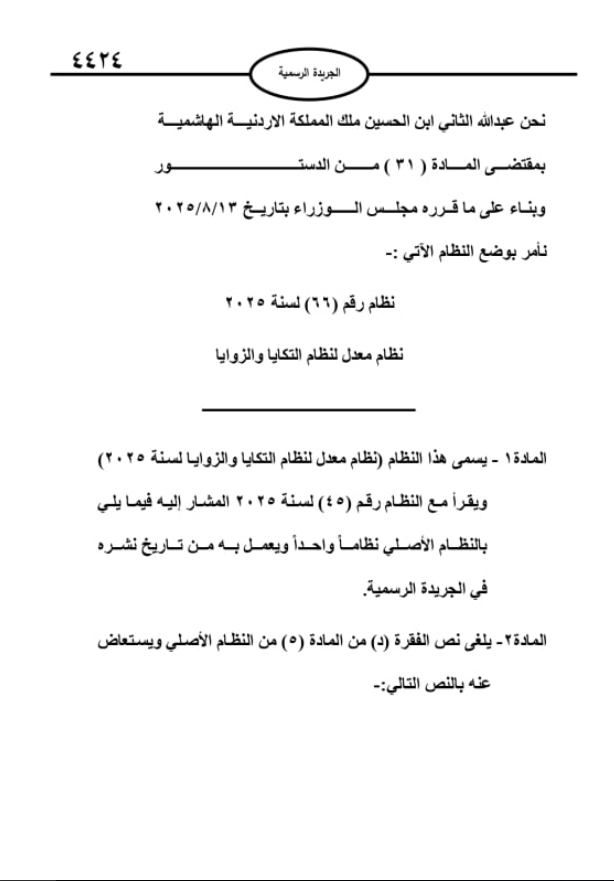 صدر في الجريدة الرسمية، الأربعاء، نظام رقم 45 لسنة 2025 الهادف لتنظيم ومراقبة عمل ما يعرف بالزوايا (المقرات الخاصة بالطرق الصوفية) والتكايا (المكان الذي يقدم فيه الطعام للمحتاجين) وكذلك الطُّرق الصوفية في المملكة ضمن أحكام قانونية واضحة ومحددة، ومراقبة عملها.