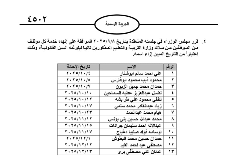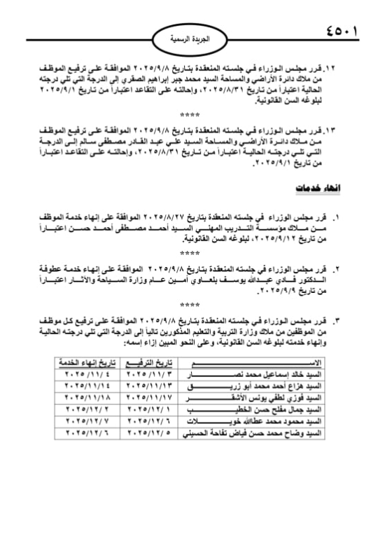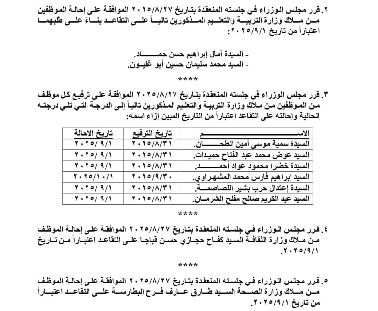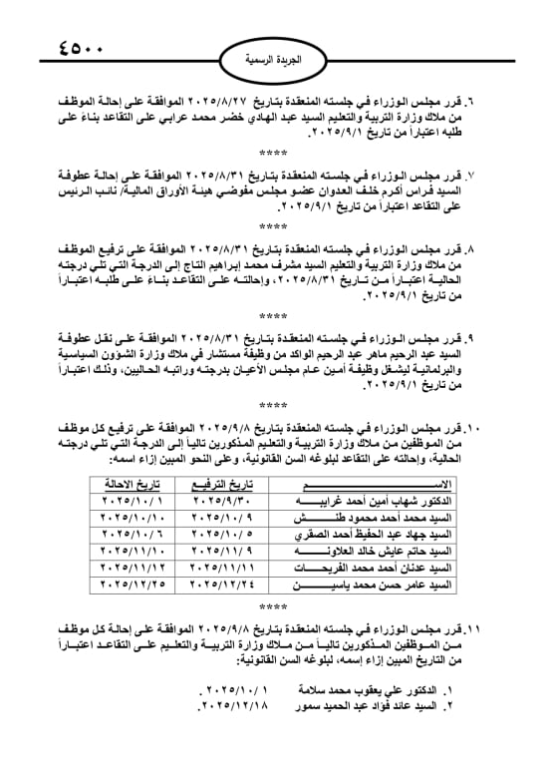 صدرت في عدد الجريدة الرسمية، اليوم الثلاثاء، قرارات مجلس الوزراء بإحالات عدد من الموظفين الحكوميين إلى التقاعد وإنهاء خدمات آخرين لبلوغهم سن التقاعد المبكر.
