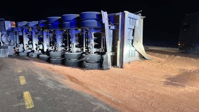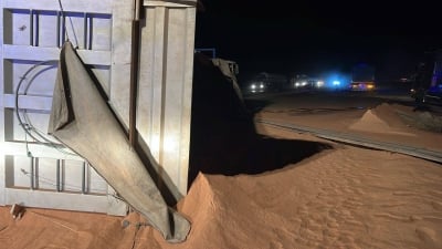 تتعامل الدوريات الخارجية في اثناء كتابة الخبر ( منتصف ليل الثلاثاء / الاربعاء) مع اثر مروري نتيجة تدهور وانقلاب تريلا شحن محملة بمادة (الفوسفات) على الطريق الصحراوي ، منطقة القويرة ما قبل جسر الاتحاد باتجاه العقبة نتيجة سقوط الحمولة بالكامل على الطريق.