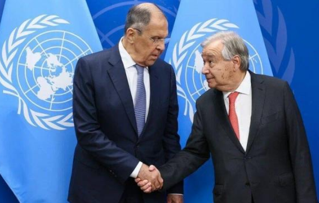 وزير الخارجية الروسي سيرغي لافروف يلتقي الأمين العام للأمم المتحدة غوتيريش — وبعد ثوانٍ يضحكان معاً.