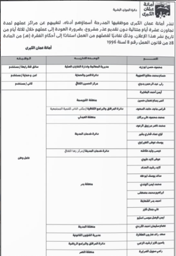 أنذرت أمانة عمان الكبرى موظفيها المدرجة أسماؤهم أدناه، لتغيبهم عن مراكز عملهم لمدة تجاوزت عشرة أيام متتالية دون تقديم عذر مشروع، بضرورة العودة إلى عملهم خلال ثلاثة أيام من تاريخ الإعلان تفاديا لفصلهم.