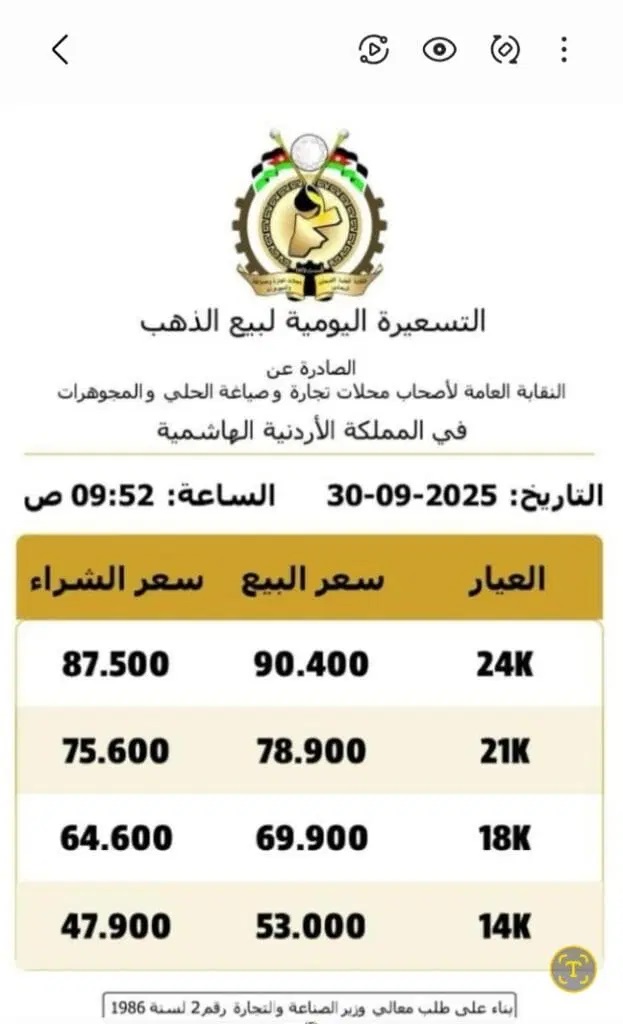 اظهرت التسعيرة اليومية لبيع الذهب في الاردن لهذا اليوم، الصادرة عن النقابة العامة لاصحاب محلات تجارة وصياغة الحلي والمجوهرات اسعار عيارات الذهب الاربعة المتداولة في السوق الاردني.