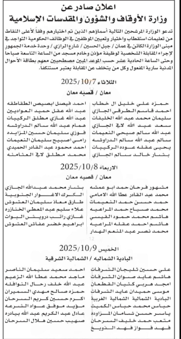 دعت وزارة الأوقاف والشؤون والمقدسات الإسلامية المرشحين المدرجة أسماؤهم إلى التواجد في مبنى الوزارة، لإجراء المقابلات الشخصية الخاصة بوظيفة مؤذن وخادم مسجد.