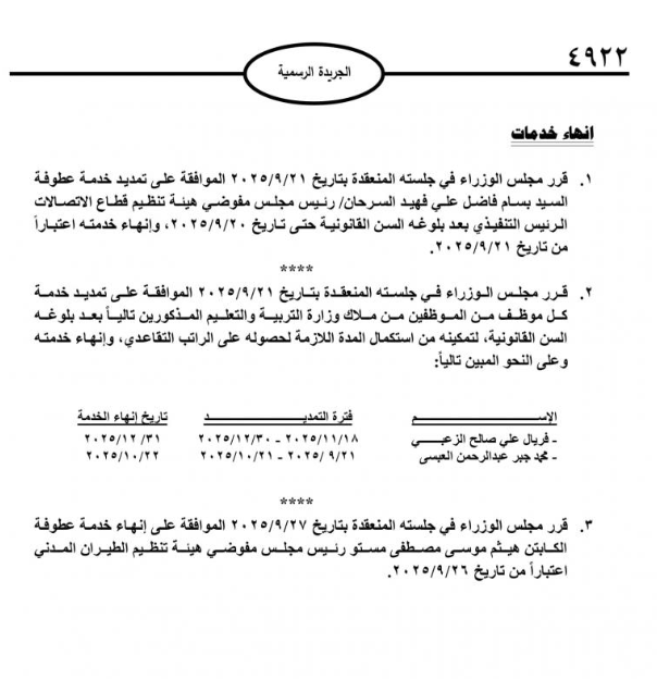 صدر في عدد الجريدة الرسمية اليوم الاربعاء، قرارات مجلس الوزراء بإحالة موظفين حكوميين إلى التقاعد، وانهاء خدمات آخرين.