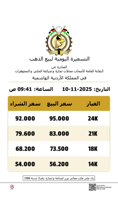 وارتفع سعر غرام الذهب عيار 21 إلى 83 دينارًا للبيع في محلات الصياغة، مقابل 79.6 دينارًا للشراء.