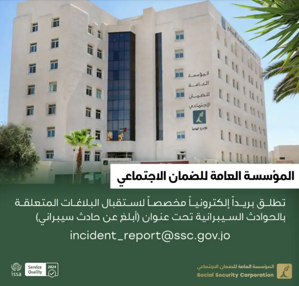 وبيّنت المؤسسة في بيان صحفي، الاثنين، أن البريد الإلكتروني المخصص للتبليغ عن الحوادث السيبرانية هو (incident_report@ssc.gov.jo) مشيرةً إلى أنه مخصص حصراً لاستقبال البلاغات المتعلقة بأي نشاط إلكتروني مشبوه أو ضار مرتبط بمؤسسة الضمان الاجتماعي وخدماتها الرقمية، مثل الصفحات الوهمية على مواقع التواصل التي تنتحل صفة المؤسسة بهدف خداع متلقي الخدمة وسرقة بياناتهم أو أموالهم، وكذلك الروابط المزيفة التي يتم إرسالها عبر الرسائل أو التعليقات أو التطبيقات المختلفة لإيهام المستخدم أنها صادرة عن المؤسسة، بينما تؤدي فعلياً إلى مواقع مزيفة لسرقة كلمات المرور أو المعلومات الشخصية.