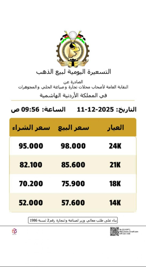 وسجل سعر غرام الذهب من عيار 21، الأكثر طلبًا بين الأردنيين، 85.6 دينارًا للبيع، و81.1 دينارًا للشراء. فيما بلغ سعر الغرام لعيارات 24 و18 و14 للغايات نفسها 98.0 و75.9 و57.6 دينارًا على الترتيب.