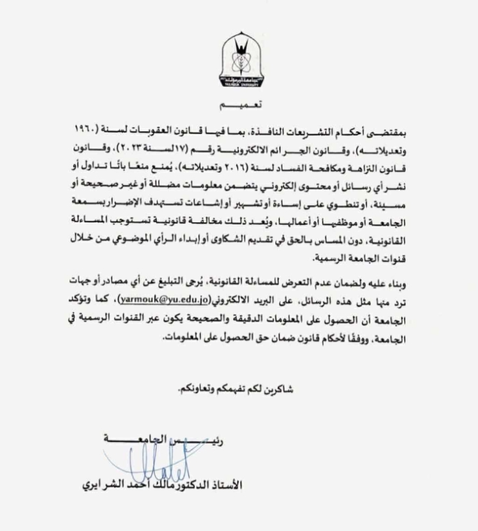 عممت جامعة اليرموك، على موظفيها المنع "منعا باتا تداول أو نشر أي رسائل أو محتوى إلكتروني يتضمن معلومات مضللة أو غير صحيحة أو مسيئة، أو تنطوي على إساءة أو تشهير أو إشاعات تستهدف الإضرار بسمعة الجامعة أو موظفيها أو أعمالها".