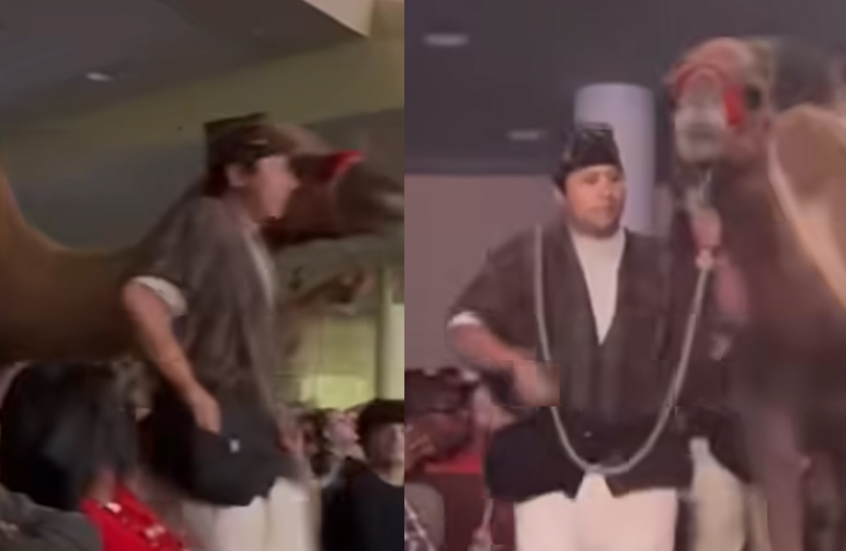 المقطع، الذي حصد أكثر من مليون مشاهدة على وسائل التواصل الاجتماعي، وثق الجمل الضخم وهو يُقاد في موكب عبر الممر المخصص للجمهور أثناء العرض.
