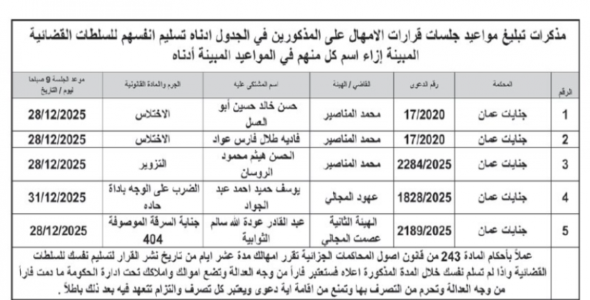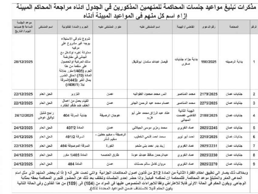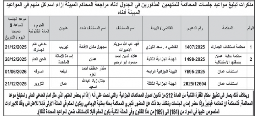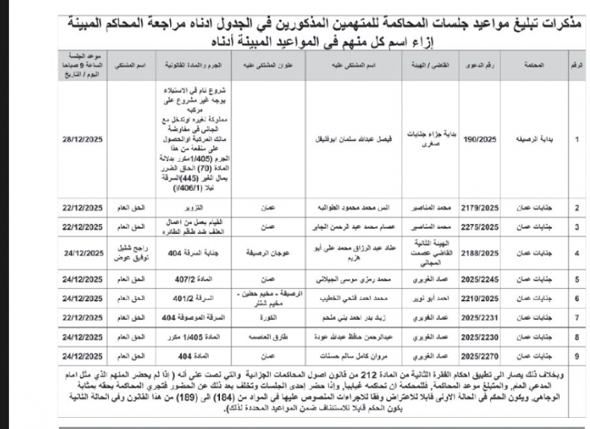 أُصدرت، اليوم الاثنين، مذكرات تبليغ رسمية تتضمن تحديد مواعيد جلسات محاكمة لمشتكى عليهم أمام المحاكم النظامية المختصة.