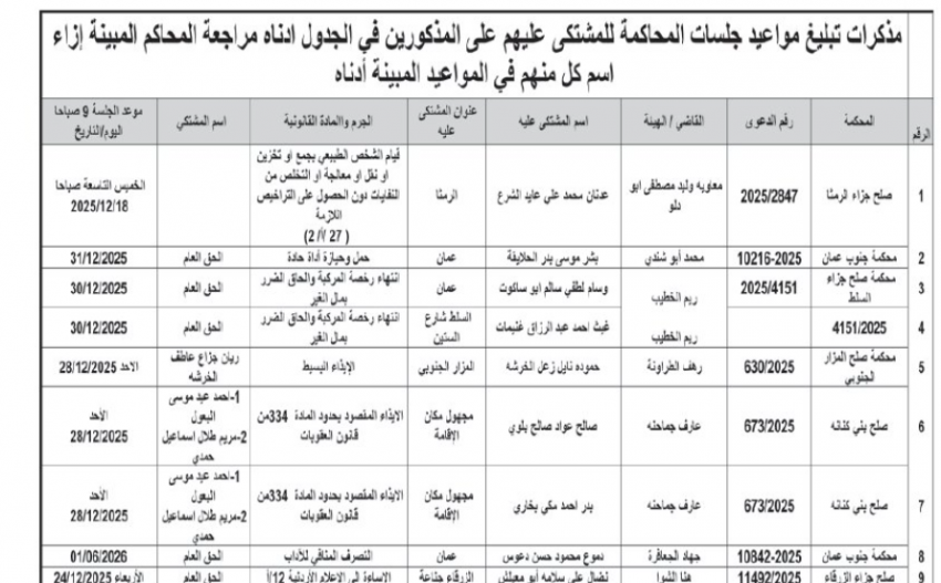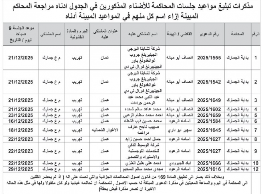 وبيّنت المذكرات أن تخلّف المشتكى عليهم عن حضور الجلسات في المواعيد المحددة قد يعرّضهم لإجراءات قانونية، من بينها احتمال إصدار أوامر قبض بحقهم، حتى في حال كانوا مكفولين.