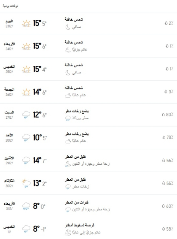 مرفق أدناه درجات الحرارة المتوقعة من اليوم وحتى يوم الخميس القادم 1/1/2026 :