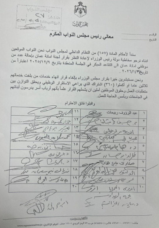 ووجه 21 نائباً مذكرة إلى رئيس مجلس النواب تبناها النائب عبدالرؤوف الربيحات، طالبوا فيها برفع المذكرة إلى رئيس الوزراء، مؤكدين أن قرار إنهاء خدمات الموظفين الذين أتموا 30 عاماً أو أكثر من الخدمة، لم يراعِ ظروفهم الأسرية، خاصة أن بعضهم يعيلون أبناء يدرسون في الجامعات، ويعانون أوضاعًا مالية صعبة.
