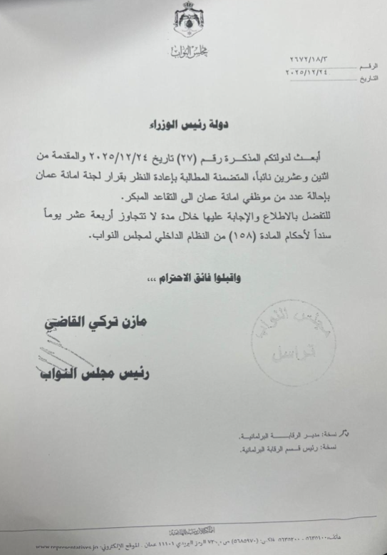 وجّه رئيس مجلس النواب مازن تركي القاضي كتاباً رسمياً إلى رئيس الوزراء جعفر حسان، الأربعاء، حصل عليه موقع خبرني يطالبه فيه بالرد على مذكرة نيابية موقعة من 21 نائباً، طالبوا فيها بإعادة النظر في قرار لجنة أمانة عمان القاضي بإنهاء خدمات عدد من الموظفين عبر إحالتهم إلى التقاعد المبكر، اعتباراً من 29/12/2025.