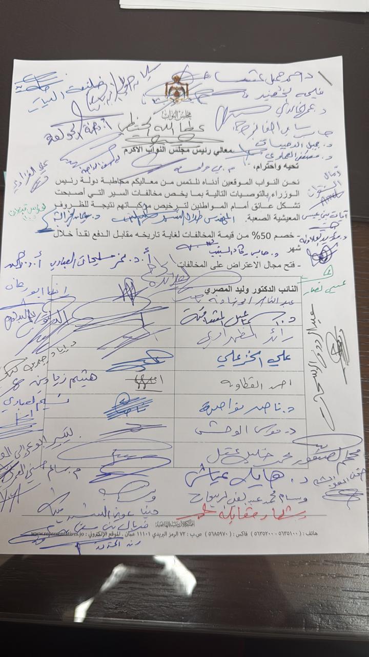 نجح النائب الدكتور وليد المصري في تحشيد 80 نائبًا وقعوا على مذكرة قدمت إلى رئيس مجلس النواب مازن القاضي لمخاطبة رئيس الوزراء جعفر حسان، تضمنت مطالب تتعلق بمخالفات السير، أبرزها خصم 50% من قيمة المخالفات المسجلة لغاية تاريخه، مقابل تسديدها نقدًا خلال مدة أقصاها ستة أشهر.