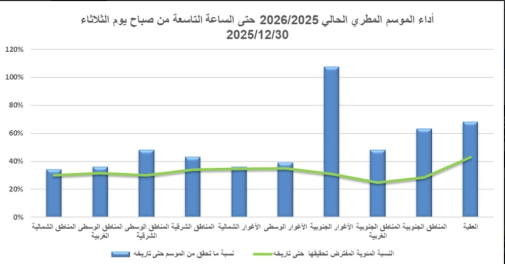 وختم الخطاب تصريحه بالإشارة إلى أن الرسم البياني المرفق يوضح أداء الموسم المطري الحالي 2025/2026، من خلال مقارنة النسبة المفترض تحقيقها من المعدل الموسمي العام حتى 30 كانون الأول 2025 مع النسب الفعلية المتحققة في مختلف مناطق المملكة.
