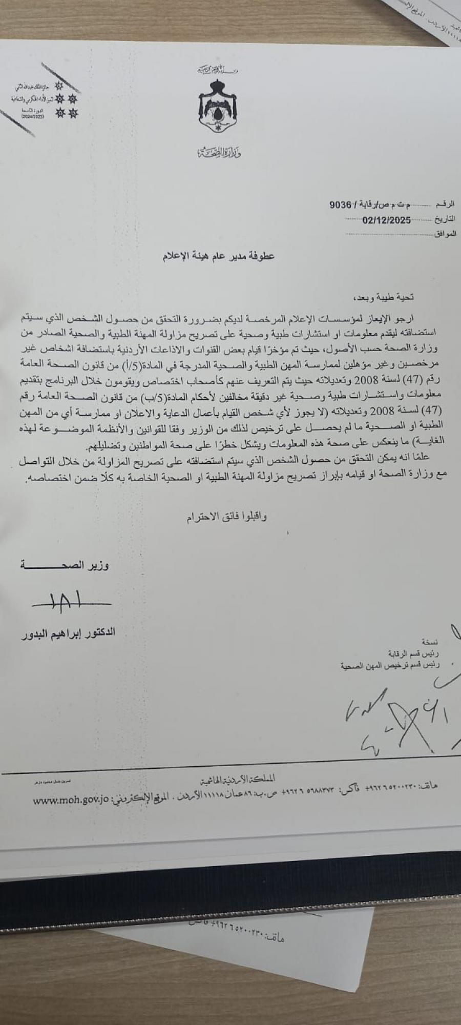الكتاب الذي وقّعه وزير الصحة الدكتور إبراهيم البدور، أكد بشكل واضح أن الالتزام بنصوص القوانين الصحية المعمول بها — وفي مقدمتها أنظمة نقابة الأطباء وقانون الصحة العامة — هو مسؤولية لا يمكن تجاوزها أو الاجتهاد فيها.