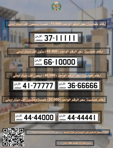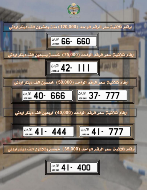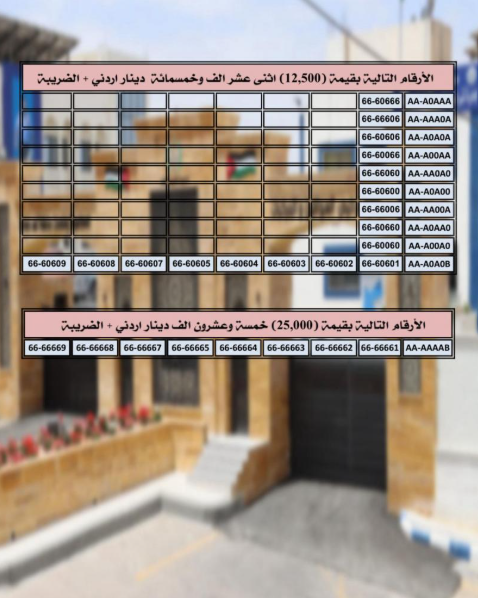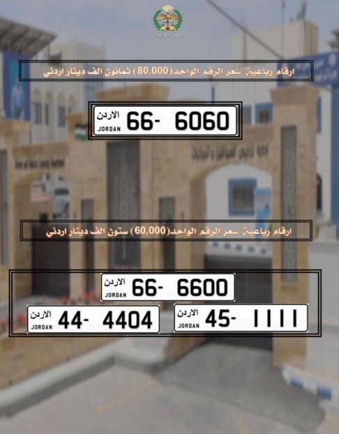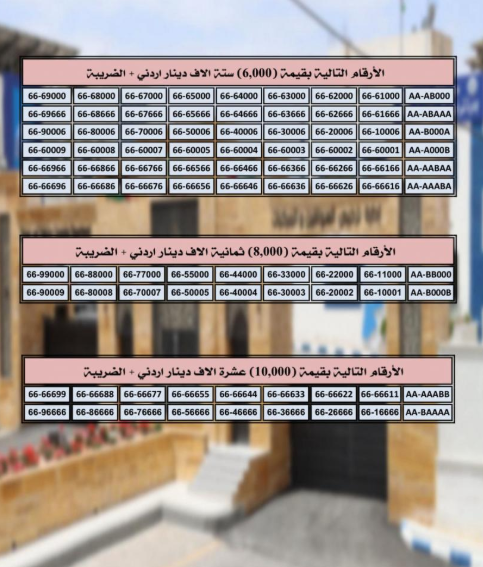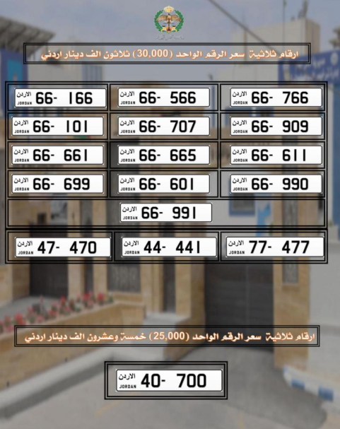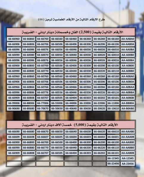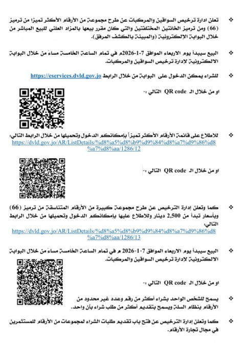 أعلنت إدارة ترخيص السواقين والمركبات عن طرح مجموعة من الأرقام الأكثر تميزا من ترميز (66) ومن ترميز الخانتين المختلفتين والتي كان مقرر بيعها بالمزاد العلني للبيع المباشر من خلال البوابة الإلكترونية.