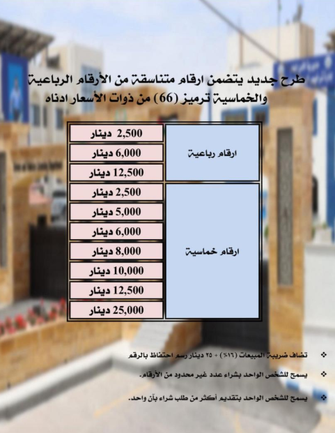 كما أعلنت عن طرح مجموعة كبيرة من الأرقام المتناسقة من ترميز (66) وبأسعار تبدأ من 2,500 دينار.