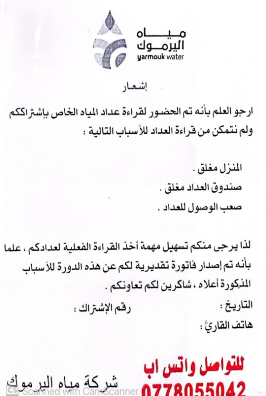 بدأت شركة مياه اليرموك بتنفيذ آلية تنظيمية جديدة تقوم على تثبيت ملصقات إشعارية على اشتراكات المياه التي يتعذر الوصول إلى عداداتها خلال جولة القراءة الشهرية، في خطوة تهدف إلى تقليص الفواتير التقديرية وتعزيز التواصل مع المشتركين.
