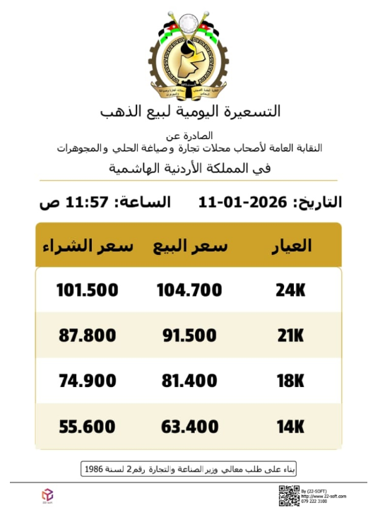 وحسب النشرة التي أصدرتها النقابة العامة لأصحاب محلات تجارة وصياغة الحلي والمجوهرات، بلغ سعر الغرام الواحد من الذهب عيارات 24 و18 و14 لغايات البيع من محلات الصاغة عند 104.70 و81.40 و63.40 دينارا على التوالي.