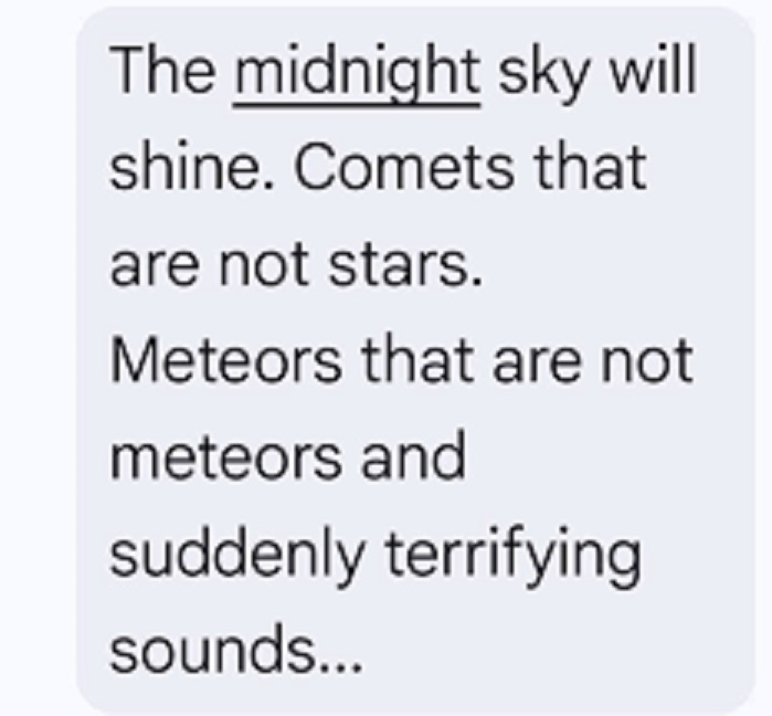 “سماء منتصف الليل ستضيء… نجوم ليست نجوماً، وشهب ليست شهباً، وأصوات مفاجئة ومخيفة”، وهو ما فُسّر على نطاق واسع كمحاولة لبث الذعر والتوتر في أوساط السكان.