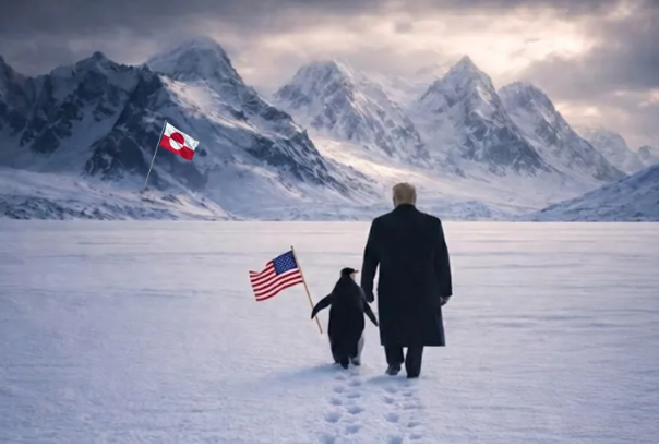 وبعد هذه المجريات المتسارعة، نشر حساب البيت الأبيض صورة مولدة بالذكاء الاصطناعي للرئيس ترمب وهو يمسك بجناح بطريق يسير في طريق تغطيه الثلوج وفي نهايته علم غرينلاند، وعلّق عليها بالقول: "احتضن البطريق".