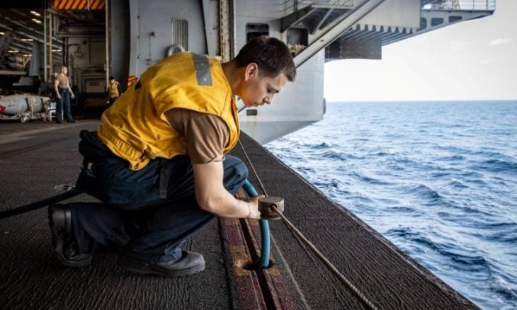 Sailors aboard USS Abraham Lincoln (CVN 72) perform routine maintenance as the aircraft carrier sails in the Indian Ocean, Jan. 26. The Abraham Lincoln Carrier Strike Group is currently deployed to the Middle East to promote regional security and stability. pic.twitter.com/dkuN946hce