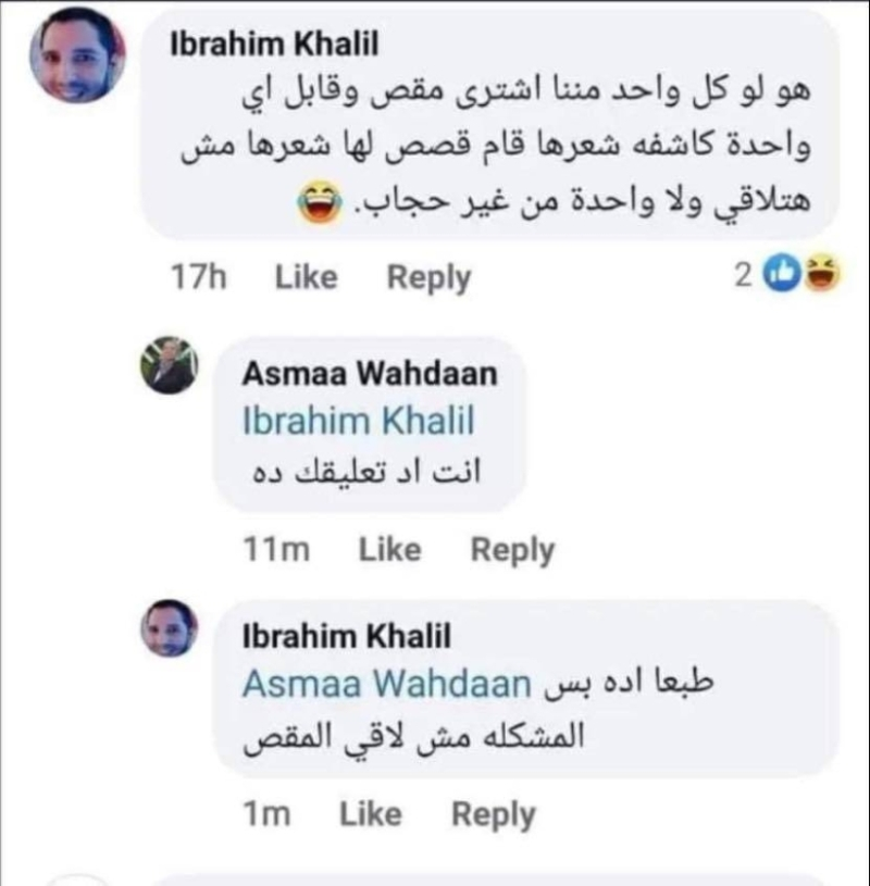 وفي العام 2022 كتب الشاب المصري إبراهيم خليل على حسابه: "لو كل واحد مننا اشترى مقصا وقابل أي واحدة كاشفة شعرها قام قاصص لها شعرها مش هتلاقي ولا واحدة من غير حجاب".