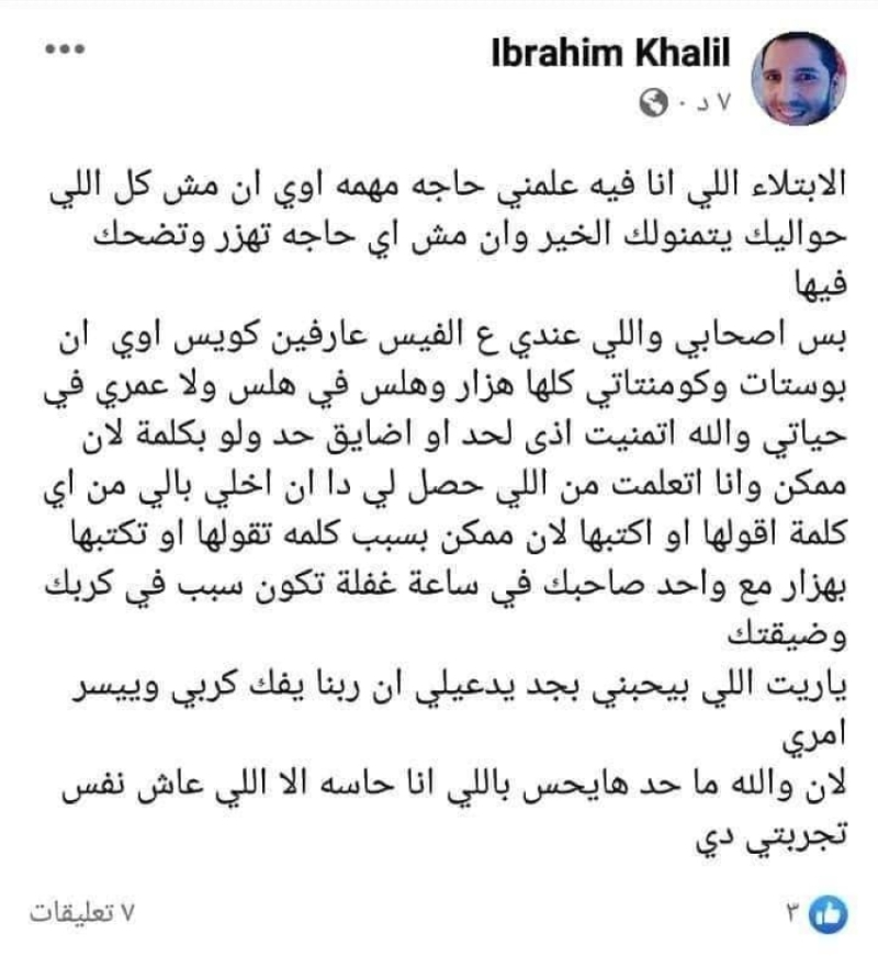 وكتب الشاب إبراهيم خليل، على صفحته بفيسبوك: "الابتلاء اللي أنا فيه علمني حاجه مهمة أوي، إن مش كل اللي حواليك يتمنوا لك الخير، وإن مش أي حاجة تهزر وتضحك فيها، بس أصحابي واللي عندي على الفيسبوك عارفين كويس أوي إن البوستات والكومنتات كلها هزار وهلس في هلس، ولا عمري في حياتي والله تمنيت أذى لحد أو أضايق حد ولو بكلمة".