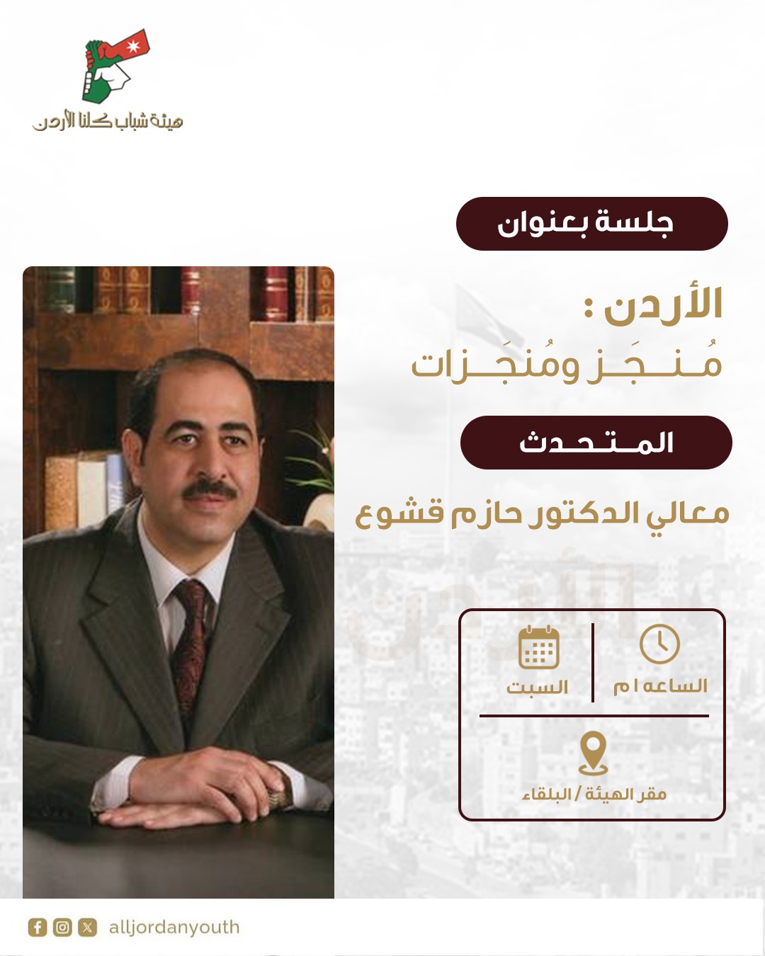 وهي الركائز الأساسية التى سأقوم ببيانها في محاضرة تحت عنوان "اردن المنجز والمنجزات" بدعوة من هيئة شباب كلنا الاردن في مدينة السلط يوم السبت القادم الموافق 31/1/2026 م بمناسبه عيد ميلاد جلالة الملك، والذي نسأل الله ان يمد بعمره وتكون حياته حافلة برغد العيش ومعنونه برسالة إنجاز يقوم مضمونها على " اردن المنجز والمنجزات ".