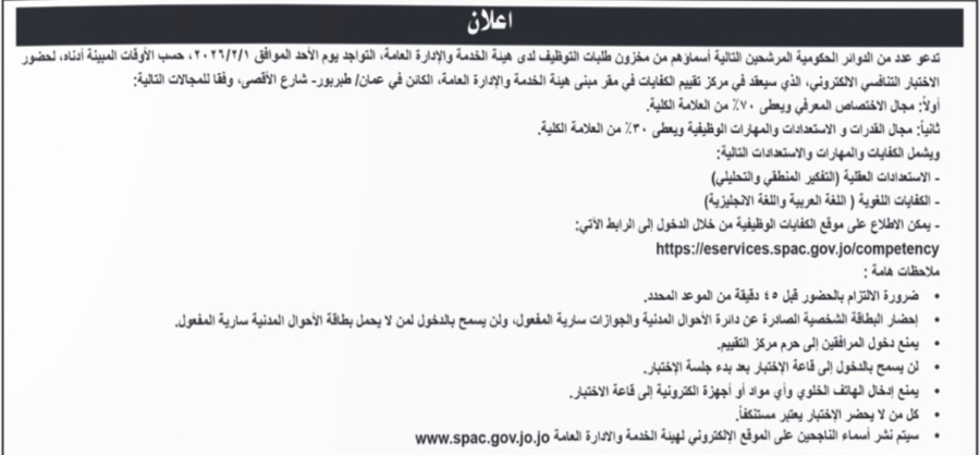 وجهت دوائر حكومية اليوم الخميس دعوات إلى جميع المرشحين الذين تنطبق عليهم الشروط الواردة في الإعلان السابق للمشاركة في الامتحان التنافسي.