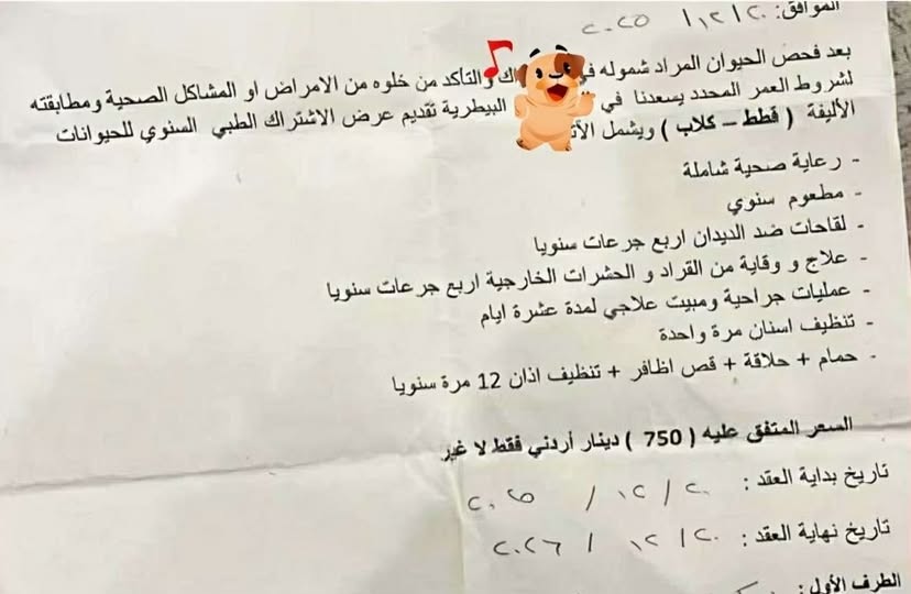 نشر مواطن أردني عبر منصات التواصل الاجتماعي صورة لعقد رعاية صحية سنوية أبرمه لكلبه مع إحدى العيادات البيطرية، بقيمة 750 دينارًا.