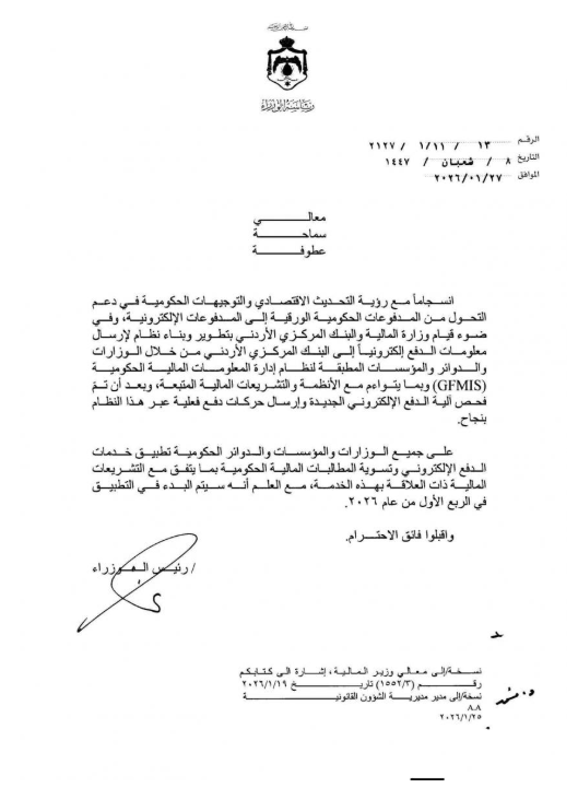 وأكد رئيس الوزراء في كتاب رسمي، أن الخطوة تأتي انسجامًا مع رؤية التحديث الاقتصادي والتوجيهات الحكومية الرامية لدعم التحول من المدفوعات الورقية إلى المدفوعات الإلكترونية، وبالتعاون مع وزارة المالية والبنك المركزي الأردني لتطوير نظام يربط معلومات الدفع الإلكتروني عبر نظام إدارة المعلومات المالية الحكومية (GFMIS)، بما يتوافق مع الأنظمة والقوانين المالية المعتمدة.