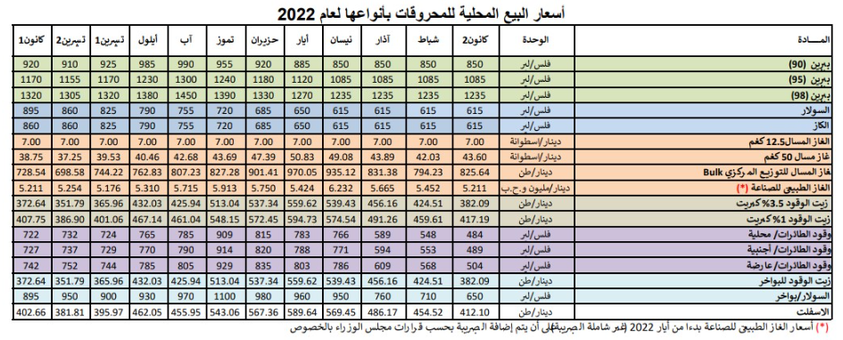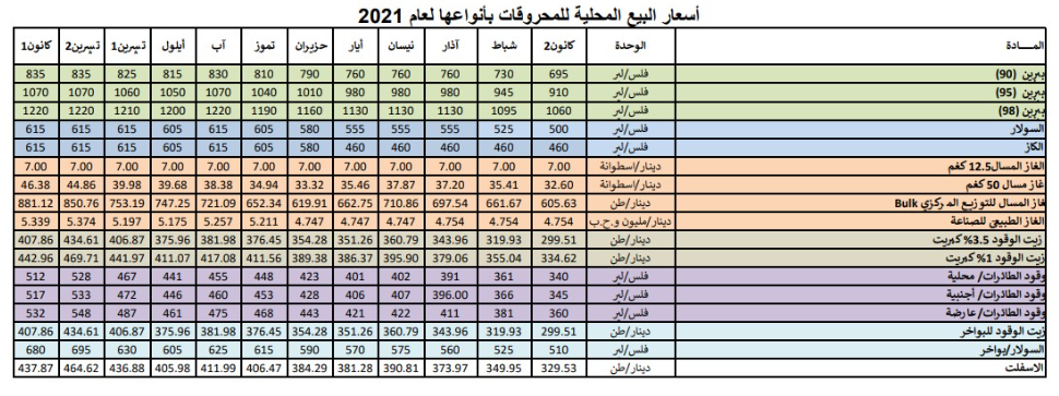 كما بينت جداول قرارات لجنة التسعير للسنوات الماضية أن سعر بيع البنزين أوكتان (95) وصل إلى ما يقارب مستوى دينار و3.5 قروش، كما هو مقرر في شهر شباط المقبل، وكان قد سجل في تموز 2021 سعرا بلغ دينارا و4 قروش للتر الواحد، وفي حزيران 2021 بلغ دينارا واحدا وقرشا للتر الواحد.